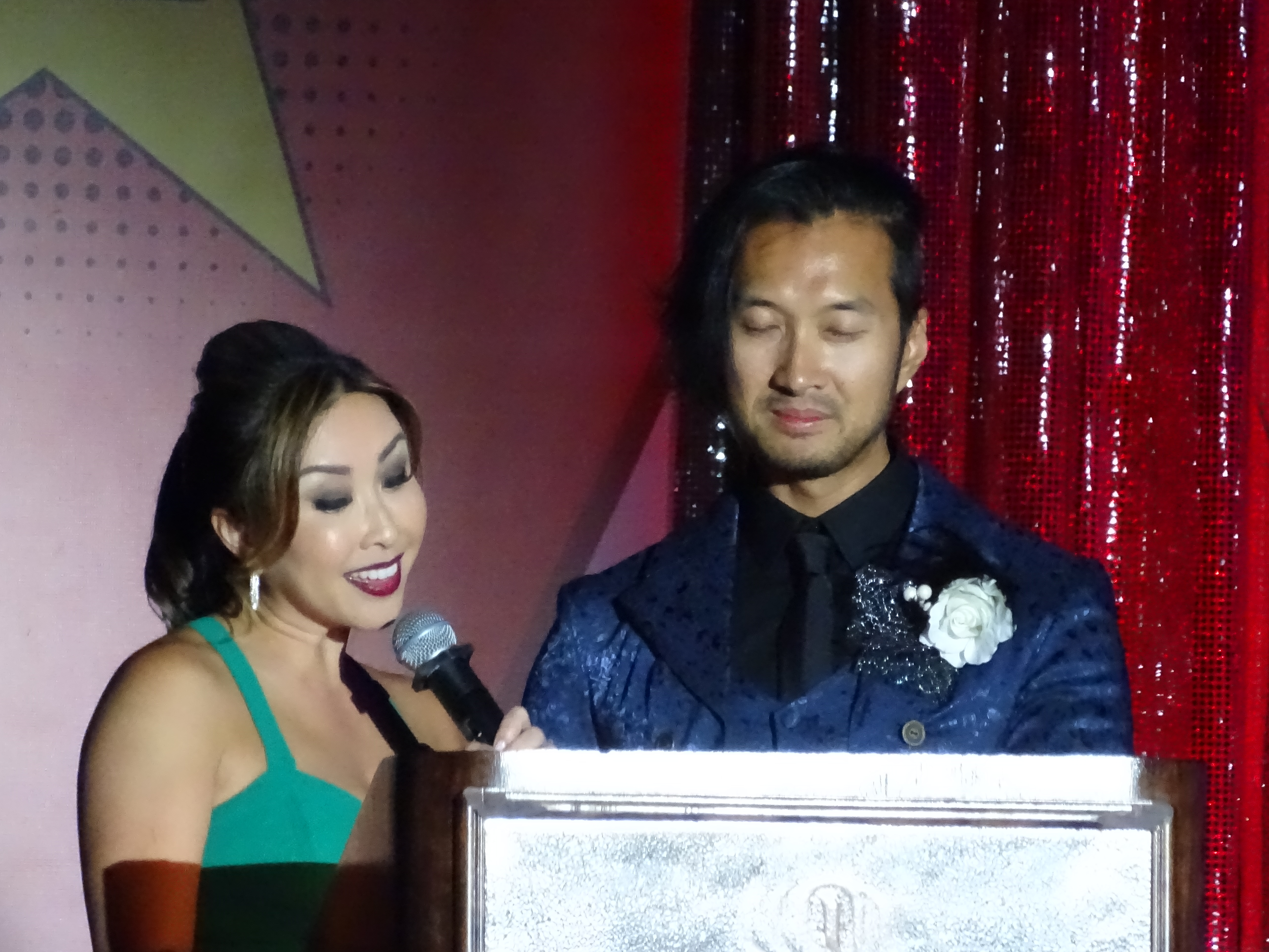 Veteran pageant MCs, KHOU-TV(s Lily Jang and KIAH-TV(s John Newinn, were charming hosts, trading jokes and keeping the audience entertained. Lily was stunning in an aqua gown and John wore a cool baroque style brocade long jacket.